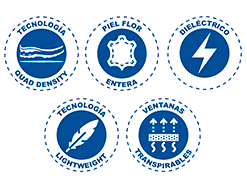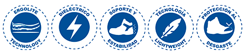 SUELA: Ergolite, Quad density: -Hule con acrilo nitrilo, -EVA, -TPU, -phylon. -Dieléctrico. Resistente 14,000 volts.