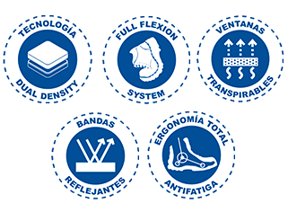 PLANTILLA: Espuma poliuretano espesor 4 mm. Forrada con textil. Acojinada, anatómica, removible y lavable.